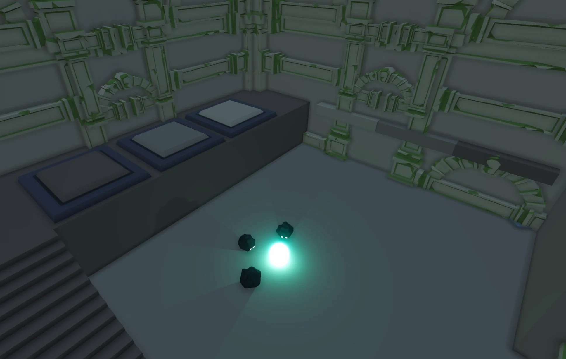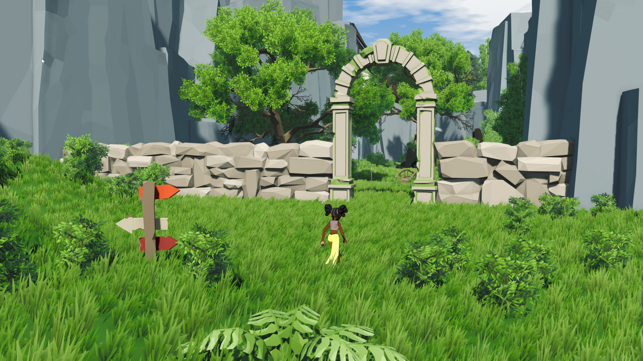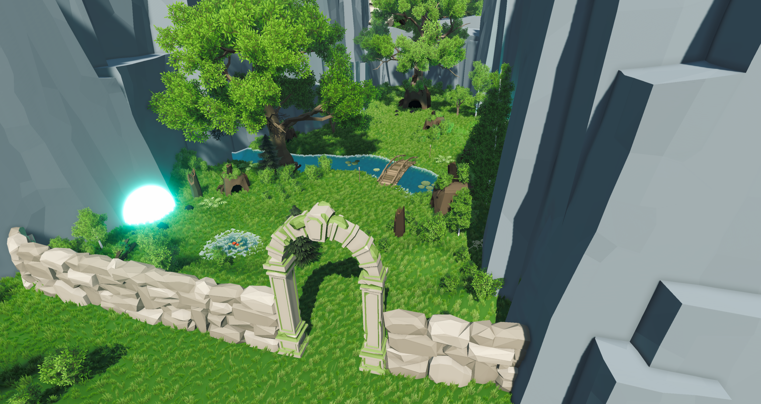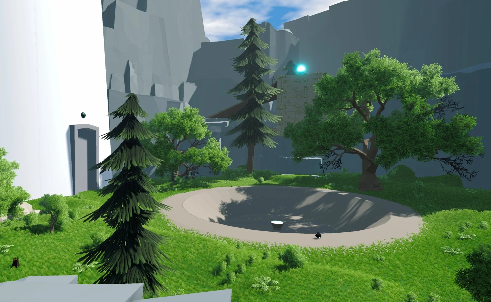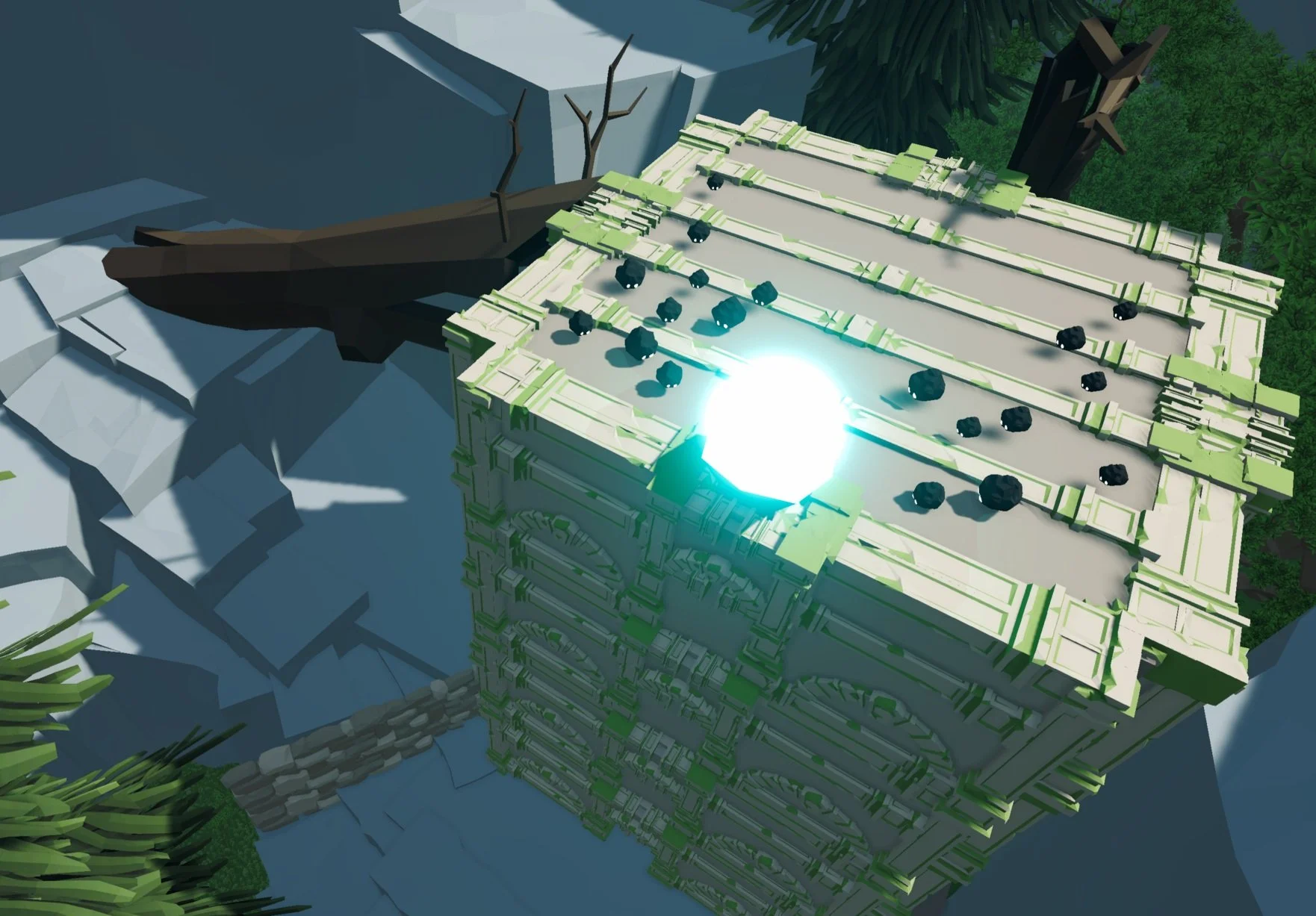 The boy awakes in the middle of a forest clearing. As he explores, he discovers a world that seems to be built for humans. The architecture feels slightly Mayan with geometric shapes and stone being very prevalent. The boy quickly discovers that this area has been inhabited by a friendly species of tiny, fluffy creatures. These creatures help the boy solve puzzles as he leads them around with glowing orbs that they seem to follow. The boy eventually realizes that these orbs can be used as a power source, and that a lot of it is needed to power the exit. The boy looks up and sees a huge ball of light on top of a nearby temple. That ball seems about the right size to power the exit.